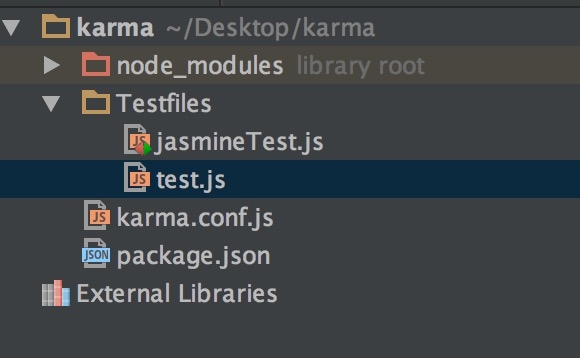 1.在项目中创建TestFiles文件夹,在文件夹中分别创建jasmineTest.js和test.js,创建完成后目录结构如下: